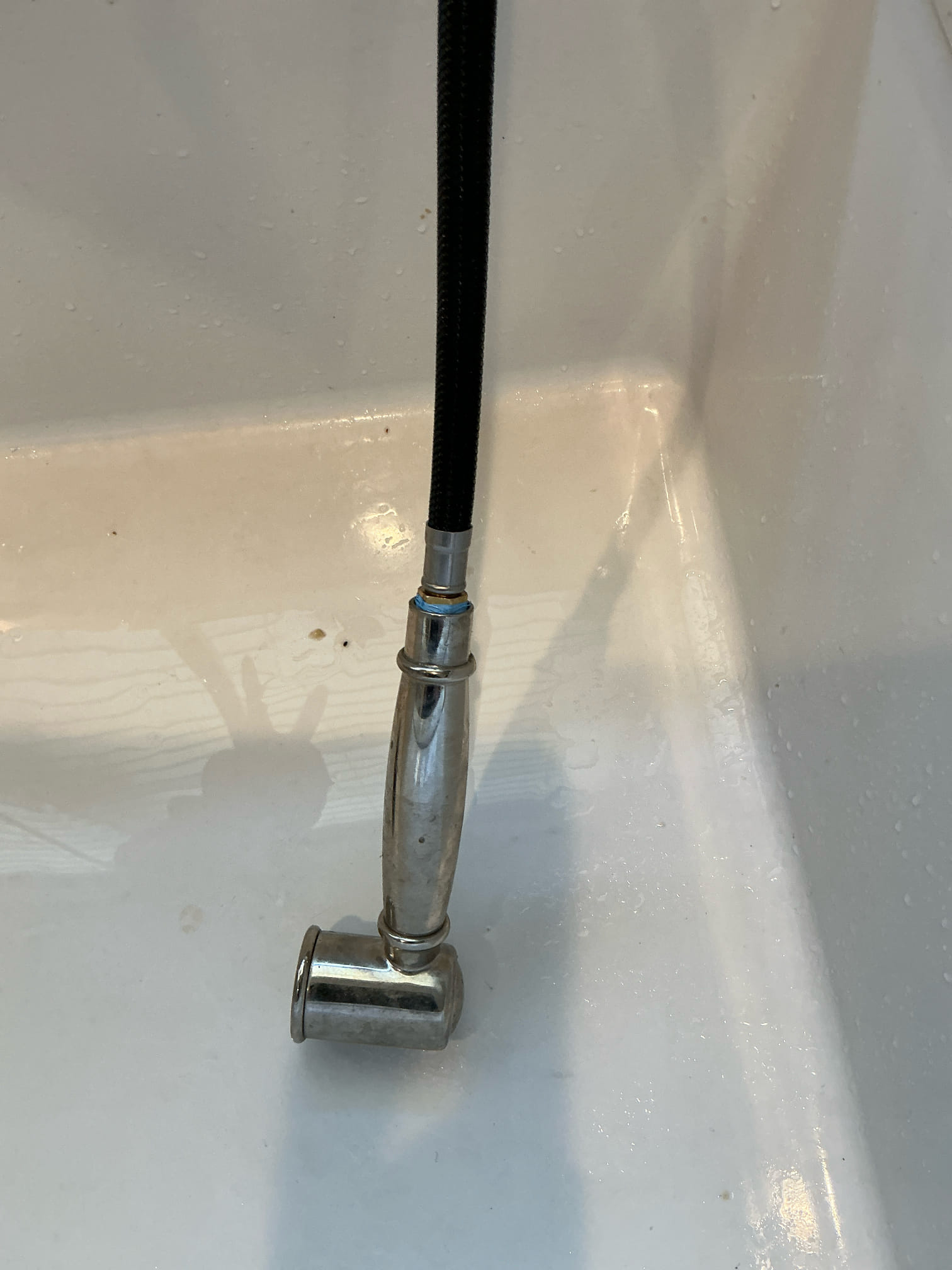 Sprayer was leaking where head connects to hose. Removed head reapplied Teflon tape to threads, checked rubber seal and reconnected sprayer head. Ran water to test. No other leaks at this time.