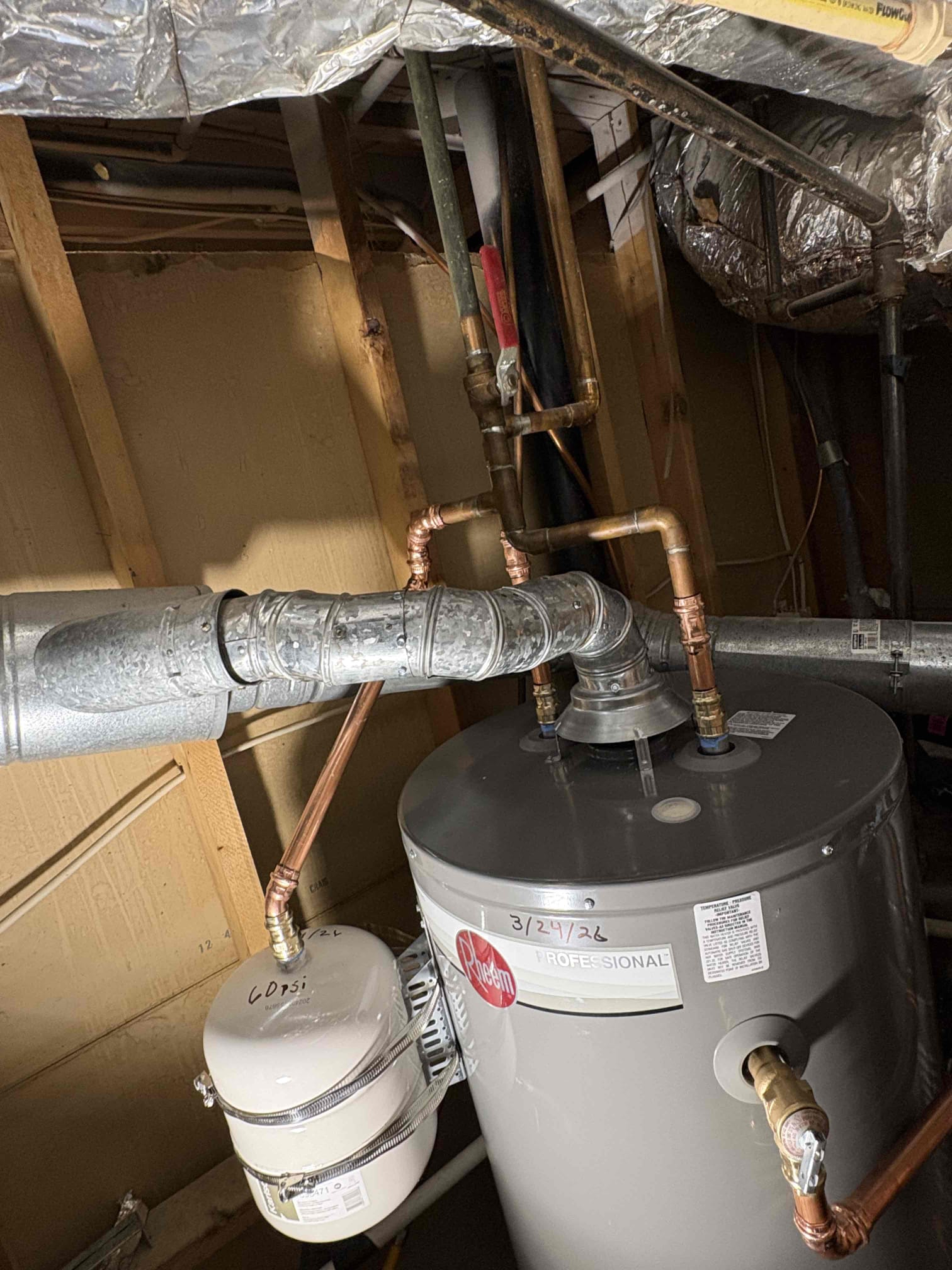 Came out today to perform our once yearly whole home plumbing inspection client gets with being a Win with Chen Service member. We checked water pressure and it was 95 psi, and we replaced the pressure reducing valve less than a year ago. We went ahead and replaced that failed pressure reducing valve under warranty with new of same model and set to 60 psi. Clients thermal expansion tank on the 7 yr old water heater had failed and was no longer doing its job for the plumbing system. With the water heater being 7 yrs old, and life expectancy being 8-10 yrs, it was decided best to replace the water heater which included the new properly supported thermal expansion tank with mount bracket per code, pumped up to match home water pressure of 60 psi. Also added a yellow coated gas flex on the new unit as well as a new pan. Client also had a good bit of copper pipe on the cold side under the kitchen sink that was super green and corroded. This line feeds the kitchen sink and the back hose